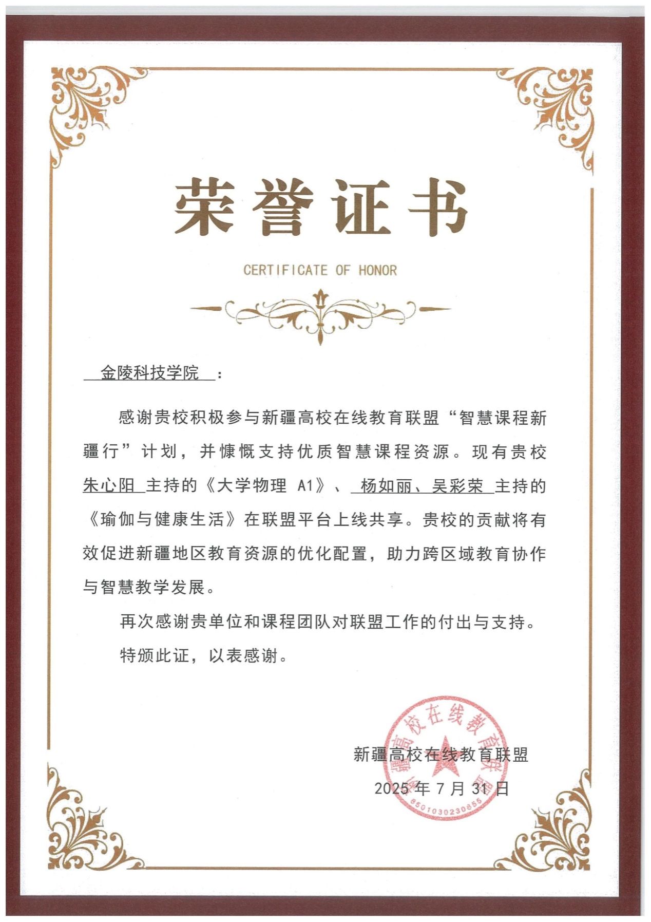 近日,“智慧课程新疆行”第一批上线课程名单公布,我校选送的课程中共两门课程通过审核,其中我院朱心阳老师的《大学物理A1》课程成功入选,上线新疆高校在线教育联盟平台。