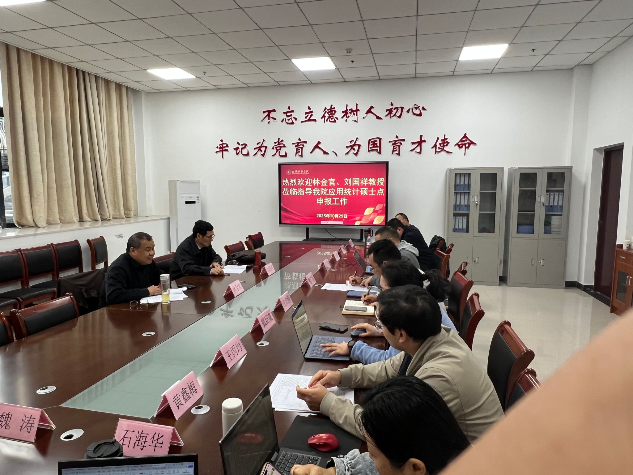 报告结束后,南京师范大学刘国祥教授也来到我院,林金官与刘国祥围绕应用统计专硕申报工作开展专项指导。两位专家建议从五方面强化建设:一是突出专业方向特色定位,二是深化实践基地校企协同,三是优化学科培养体系架构,四是加强师资队伍双师型建设,五是完善质量监控与评价机制。系统指导为提升专硕申报质量提供了多维度思路和操作性方案。